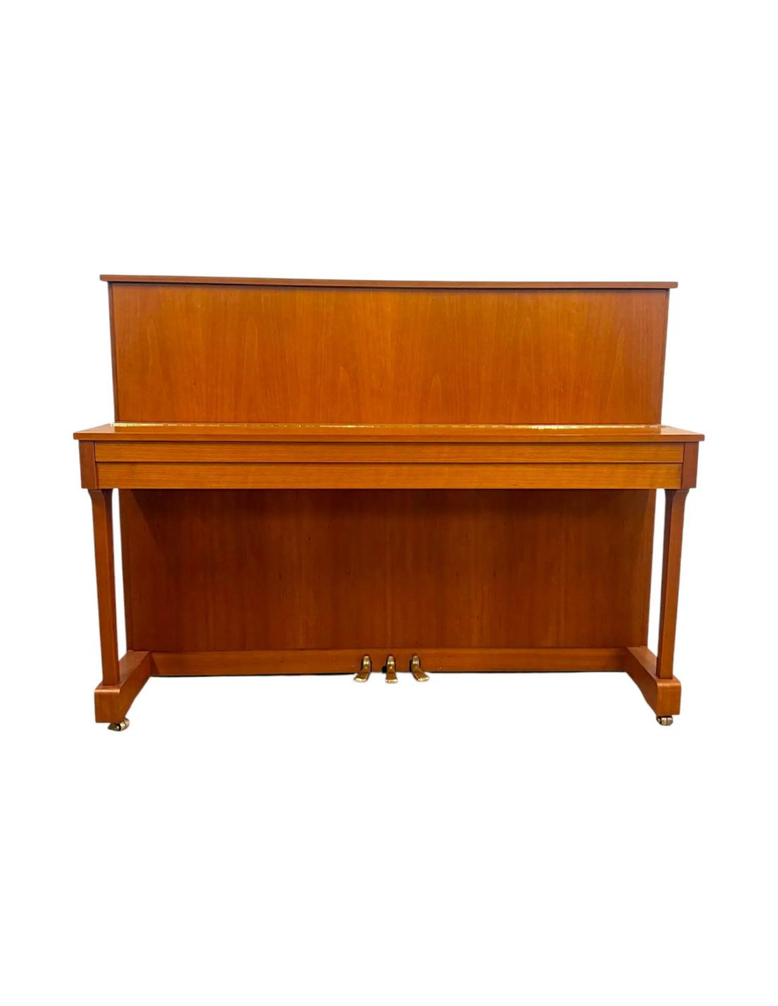 Très beau piano de chez Yamaha, le E116 est plus confidentiel que certain modèle qu'on ne présente plus chez la marque japonaise. Entièrement fabriqué dans les usines anglaises de Yamaha, ces instruments ont une sonorité plus attachante et plus européenne que leur gamme issue du Japon. On retrouve toujours une mécanique incroyablement agréable et flatteuse à jouer et une finition merisier satinée dans un très bel état.